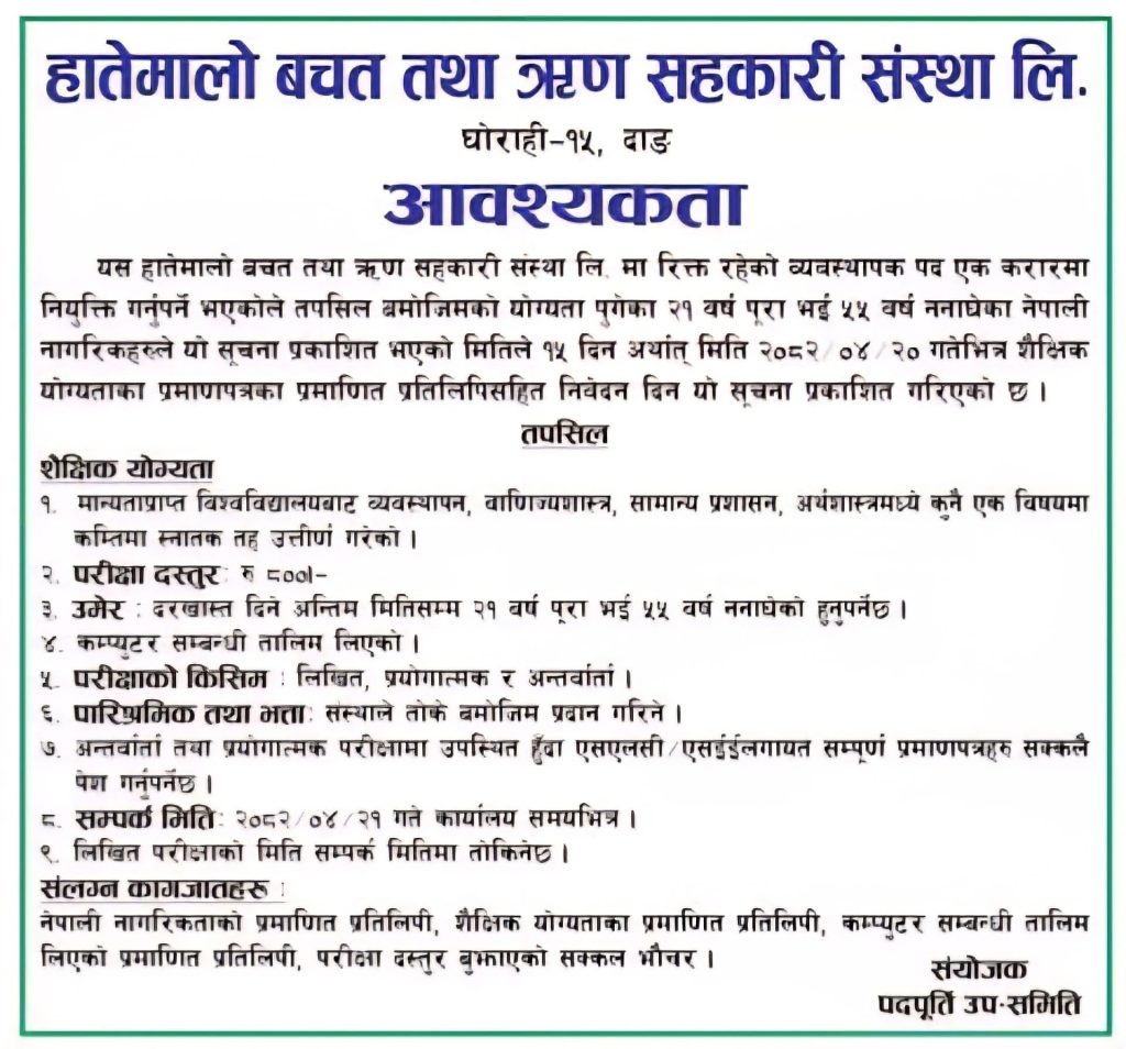 हातेमालो बचत तथा ऋण सहकारी संस्था लिमिटेड, घोराही- १५, दाङका लागि करार सेवाका काम गर्ने गर्ने २१ वर्ष पूरा भइ ५५ वर्ष ननाघेको व्यवस्थापक पदको लागि विज्ञापन गरेको छ ।