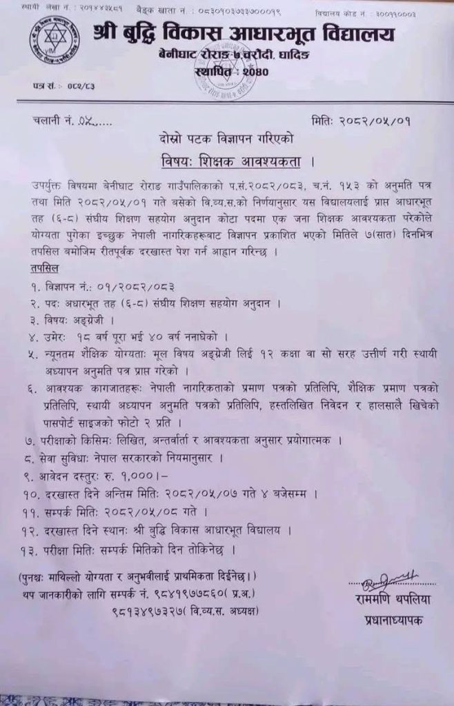 धादिङको बेनीघाट रोराङ ७ मा अवस्थित श्री बुद्धि विकास आधारभूत विद्यालयको लागि शिक्षक पदपूर्ति सम्बन्धी दोस्रो पटक विज्ञापन गरिएको सूचना बमोजिम संघीय शिक्षण सहयोग अनुदानकोटामा करार पदपूर्तिहुने गरी आधारभूत तह कक्षा ६-८ को लागि शिक्षकको लागि विज्ञापन गरेको छ ।
