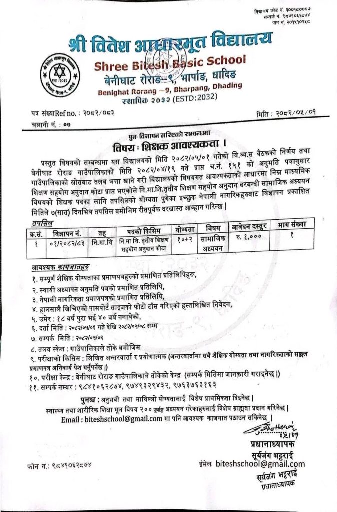 धादिङको बेनीघाट रोराङ ९ मा अवस्थित श्री वितेश आधारभूत विद्यालयको लागि शिक्षक पदपूर्ति सम्बन्धी दोस्रो पटक विज्ञापन गरिएको सूचना बमोजिम गाउँपालिकाको स्रोतबाट भत्ता खानेगरी सहयोग अनुदानकोटामा करार पदपूर्तिहुने गरी आधारभूत तह कक्षा ६-८ को लागि सामाजिक विषयको शिक्षकको लागि विज्ञापन गरेको छ ।