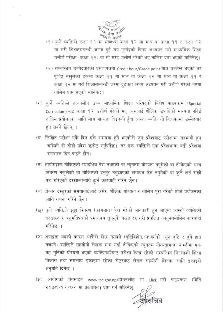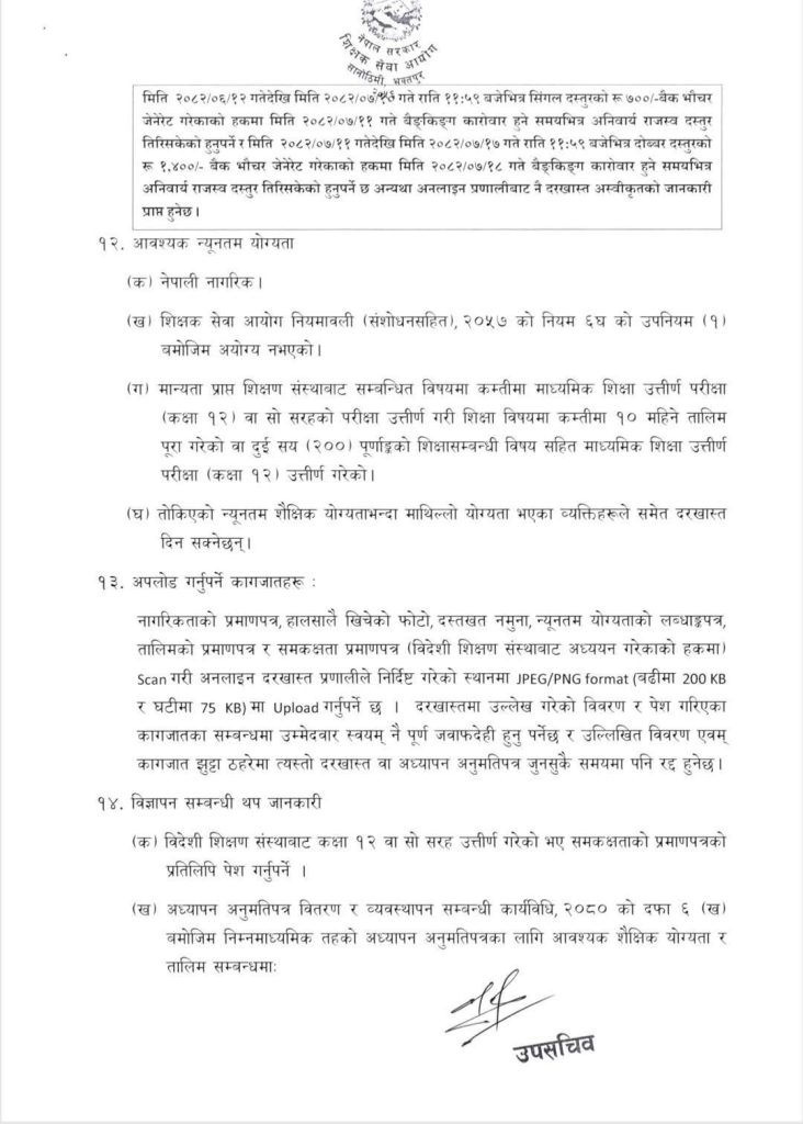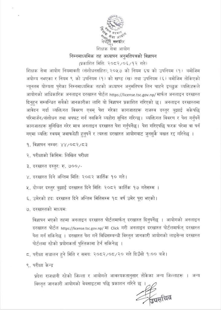 मिति २०८२।०६।१२ गते प्रकशित शिक्षक सेवा आयोगले सूचना बमोजिम निम्नमाध्यमिक तहको लागि अध्यापन अनुमतिपत्रको लागि विज्ञापन प्रकाशन गरेको छ ।