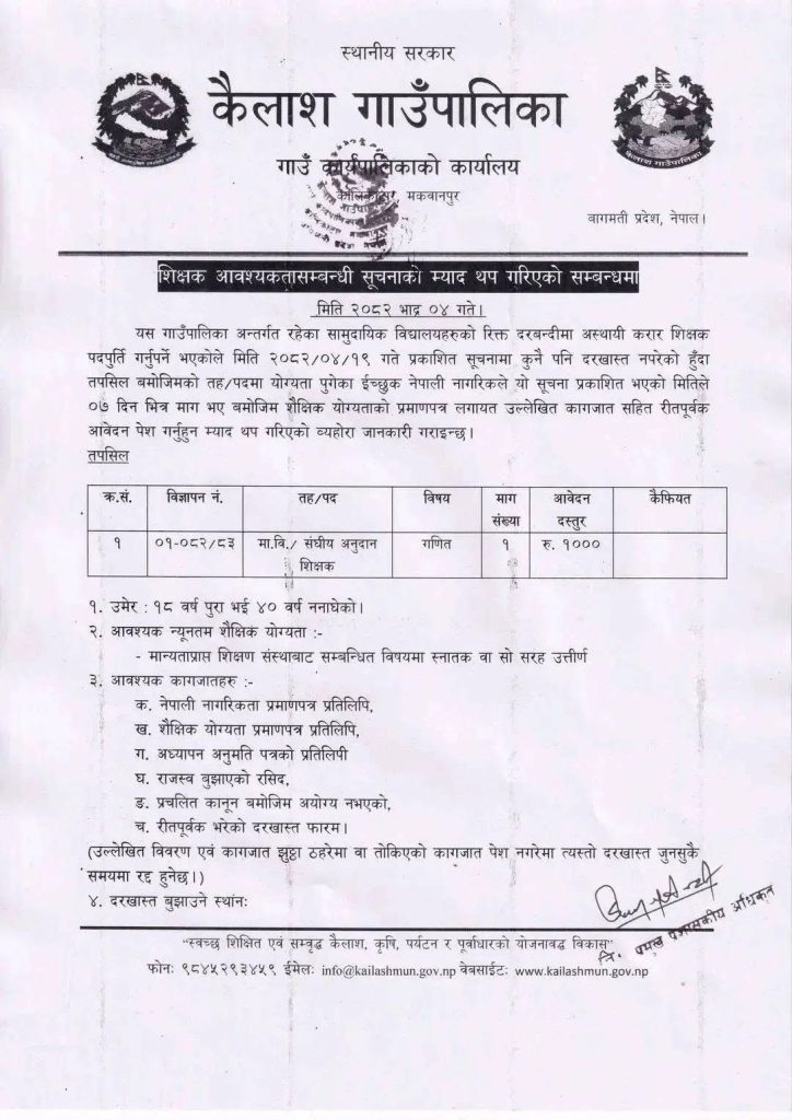 कैलाश गाउँपालिका, गाउँपालिकाको कार्यालयको मित २०८२।०४।०४ को शिक्षक आवश्यकता सम्बन्धी सूचनाको म्याद थप गरिएको सूचना बमोजिम माध्यमिक तह गणित विषयको संघीय अनुदानकोटामा करार पदपूर्तिहुने गरी माध्यमिक तहको लागि गणित विषयको शिक्षकको लागि विज्ञापन गरेको छ ।