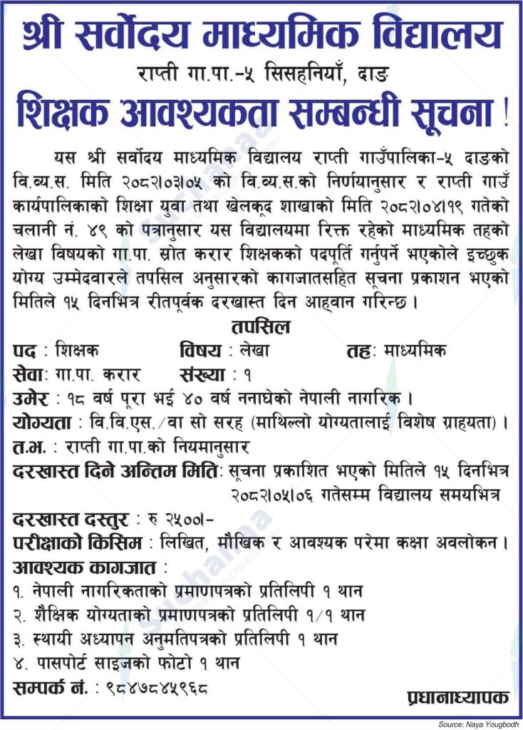 राप्ती गाउँपालिका वडा नं. ५ सिसहनियाँ, दाङमा रहेको श्री सर्वोदय माध्यमिक विद्यालयमा माध्यमिक तह लेखा विषय पढाउने शिक्षक अवश्यक परेको हुदाँ इच्छुक योग्य उम्मेदवारहरु अवश्यक कागजात सहित सूचना प्रकाशन भएको मितिले १५ दिन भित्र दरखास्त पेश गर्न सकिन्छ । थप जानकारीको लागि तलको सुचना हेर्न सकिन्छ ।