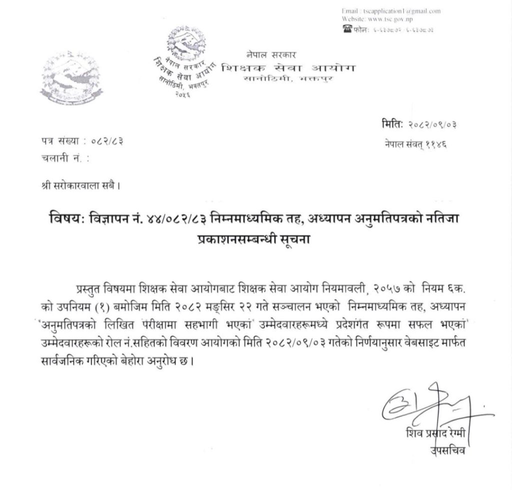 २०८२ मंसिर २० गते शिक्षक सेवा आयोग द्बारा सञ्चालन भएको निम्न माध्यमिक तहको शिक्षक अध्यापन अनुमति पत्रको नतिजा पौष ३ गते प्रकाशन भएको छ । नतिजा हेर्नको लागि तल प्रदेशगत रुपमा सम्बन्धित प्रदेशमा क्लिक गरी हेर्न सक्नुहुनेछ ।