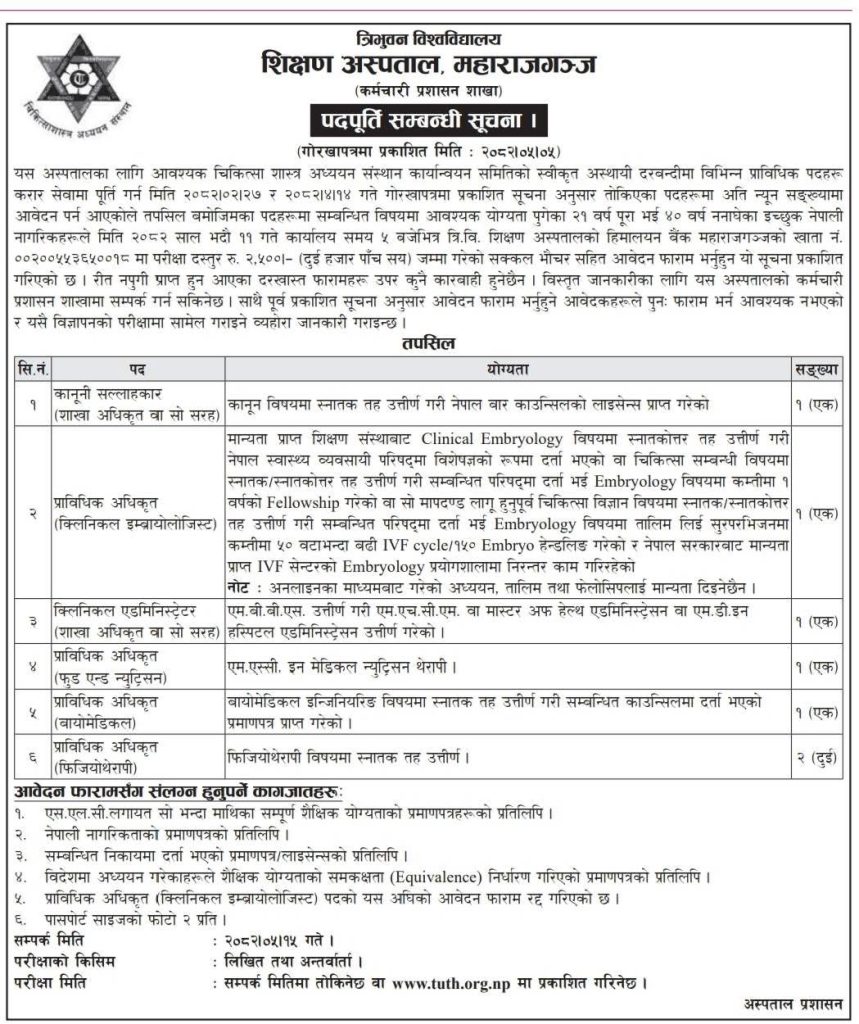 त्रिभुवन विश्वविद्यालय, शिक्षण अस्पताल, महाराजगञ्जको कर्मचारी पदपूर्ति सम्बन्धी विज्ञापन गरिएको । २०८२।०५।०५ गतेको सूचना बमोजिम चिकित्सा शास्त्र अध्ययन संस्थान कार्यान्वयन समितिको स्वीकृत अस्थायी दरबन्दीमा कानूनी सल्लाहकार १ जना, प्राविधिक अधिकृत (क्लिनिकल इम्ब्रायोलोजिस्ट) १ जना, क्लिनिकल एडमिनिस्ट्रेटर १ जना, प्राविधिक अधिकृत (फुड एन्ड न्यूट्रिसन) १ जना, प्राविधिक अधिकृत (बायोमेडिकल) १ जना र प्राविधिक अधिकृत (फिजियोथेरापी) २ जना गरी जम्मा ७ अस्थायी पूर्तिहुने गरी कर्मचारीको लागि विज्ञापन गरेको छ ।