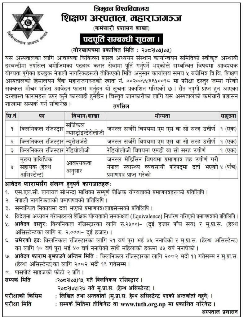 त्रिभुवन विश्वविद्यालय, शिक्षण अस्पताल, महाराजगञ्जको कर्मचारी पदपूर्ति सम्बन्धी विज्ञापन गरिएको सूचना बमोजिम चिकित्सा शास्त्र अध्ययन संस्थान कार्यान्वयन समितिको स्वीकृत अस्थायी दरबन्दीमा क्लिनिकल रजिस्टार पदमा ३ जना र हेल्थ असिस्टेन्ट पदमा ५ जना गरी जम्मा ८ अस्थायी पूर्तिहुने गरी कर्मचारीको लागि विज्ञापन गरेको छ ।
