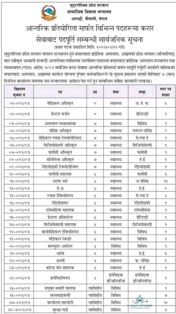 सुदुरपश्चिम प्रदेश सरकार, सामाजिक विकास मन्त्रालय, धनगढी, कैलालीले २०८२।०४।२२ गते को प्रथम पटक प्रकाशित विज्ञापन अनुसार २८ पदमा ८३ जना कर्मचारीलाई करार सेवामा राख्ने गरी आन्तरिक प्रतियोगिता मार्फत करार सेवामा पदपूर्ती गर्ने गरी विज्ञापन गरेको छ ।