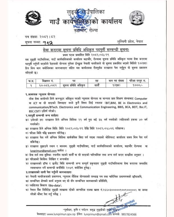 लुङ्ग्री गाउँपालिका, गाउँपालिकाको कार्यालय, बडाचौर, रोल्पाको वि.नं. १०-०८१/०८२ अधिकृतस्तर सातौँ तह सूचना प्रविधि अधिकृत पदको लागि मिति २०८२ असार २९ गते देखि श्रावण ०६ गते सम्म दरखास्त दिनको लागि सूचना प्रकाशन गरिएको छ ।
